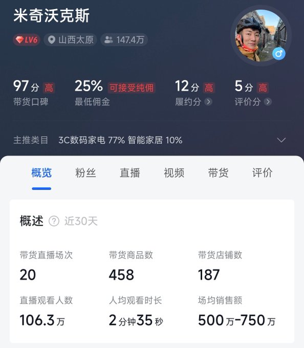 相比几个月之前,他现在做的越来越好了,直播很熟练,表达很流畅,米奇沃克斯的确升级了,进入到了3.0版本,甚至连直播切片都表达也超过了之前精心策划的VLOG视频。简洁清晰,言之有物,据说去年年初就单月带货超过一亿,现在就更多了,现在每场带货500到750万,前几天一场做了一千万。一个月20场。最低佣金25%。一个月纯赚3千万的收入水平。一年落袋几个亿。