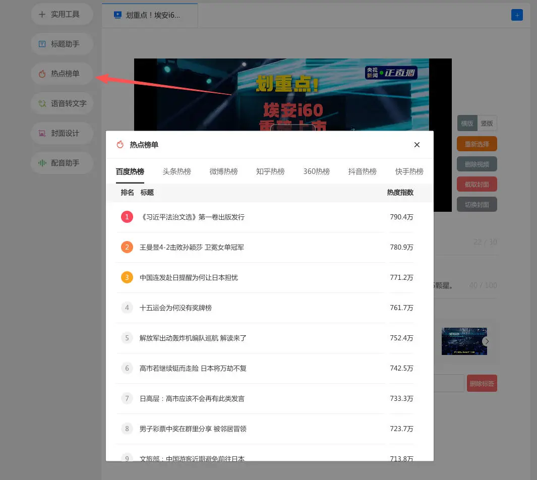 发布时可以查看当前的热点榜单,方便进行标题适配,也方便选择合适的标签进入流量池。