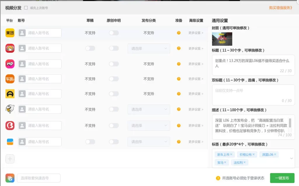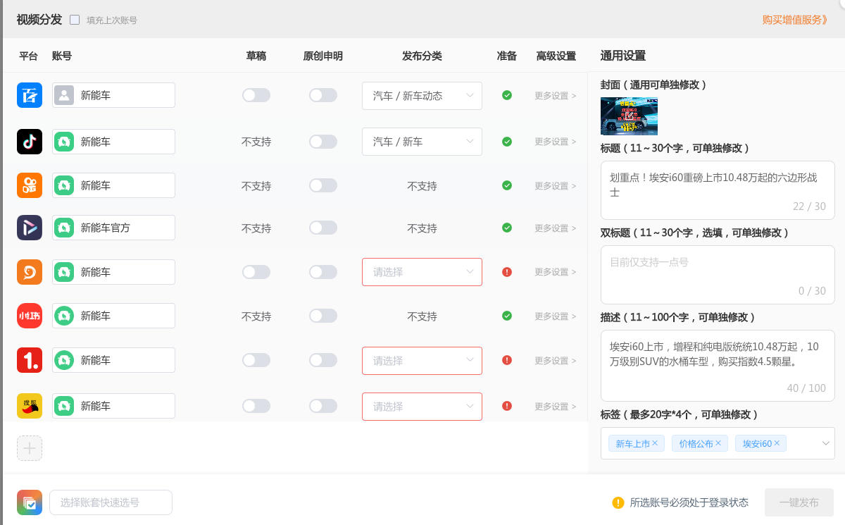 第一次发布时,选择账号界面有点混乱,没有批量选择账号的方式,也没有批量设置分类的方式,这一点如果能改善,将很大概率提高效率。