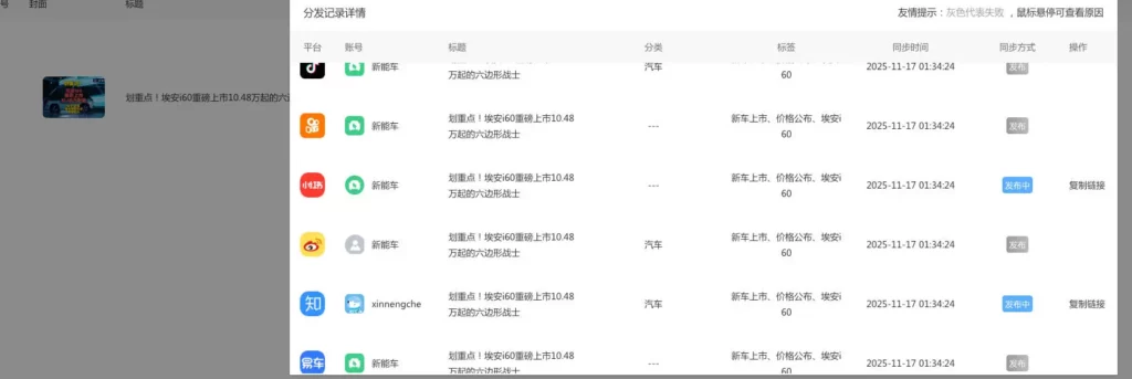 在点了批量发布按钮之后,发现 百家号、抖音号、快手号、微博号、易车号发布失败。原因无一例外提示“账号未登录,请先登录账号”。有点不太能接受,这些账号都是我一个小时前刚刚登录,并且检查过登录状态了。