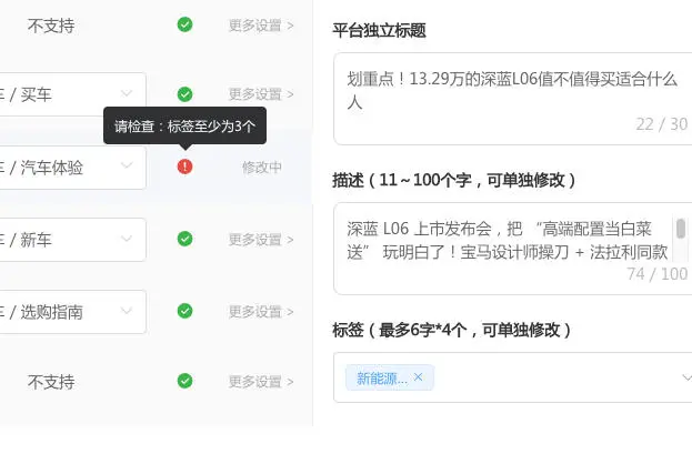 再整理一下今天遇到的问题,我在上传视频阶段,已经设置过标签了,但是点了一键分发之后,所有视频的标签并没有同步过来,还是会限时标签至少为3个之类的提示。