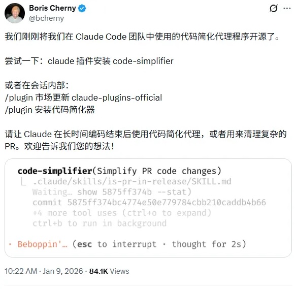 Claude Code 创始人 Boris 开源了一个有用的插件,Claude团队一直在用的代码简化神器 code-simplifier ,他能帮你在大量编码之后一键梳理混乱的逻辑。